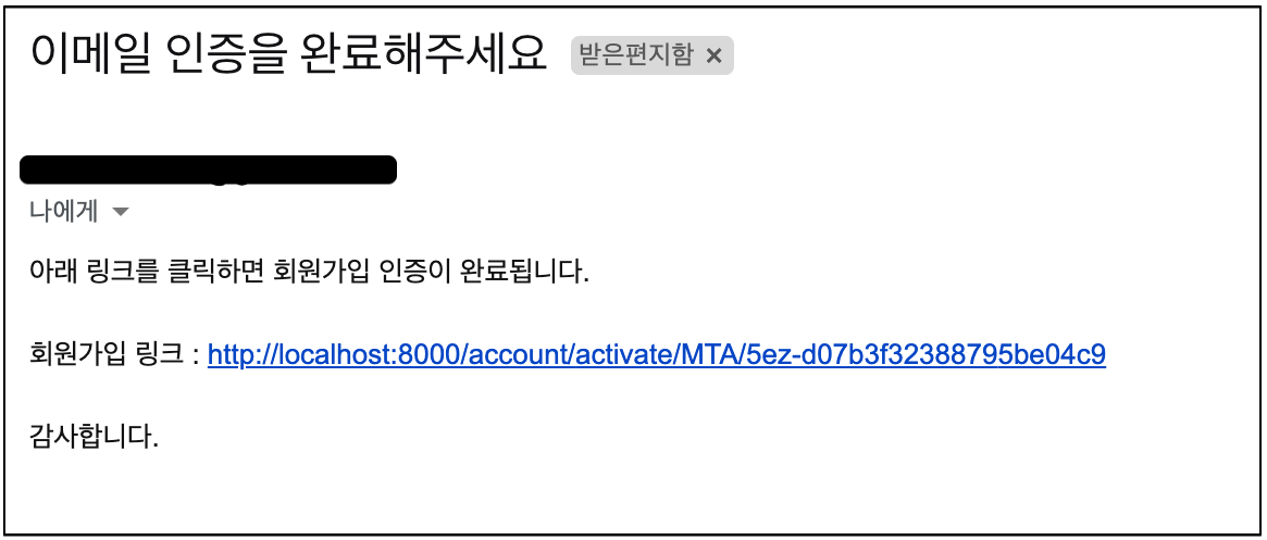 회원가입 엔드포인트로 이메일과 패스워드를 입력 시 가입이 완료되며, 아래와 같이 회원 가입 인증 메일이 발송된 것을 확인할 수 있다.