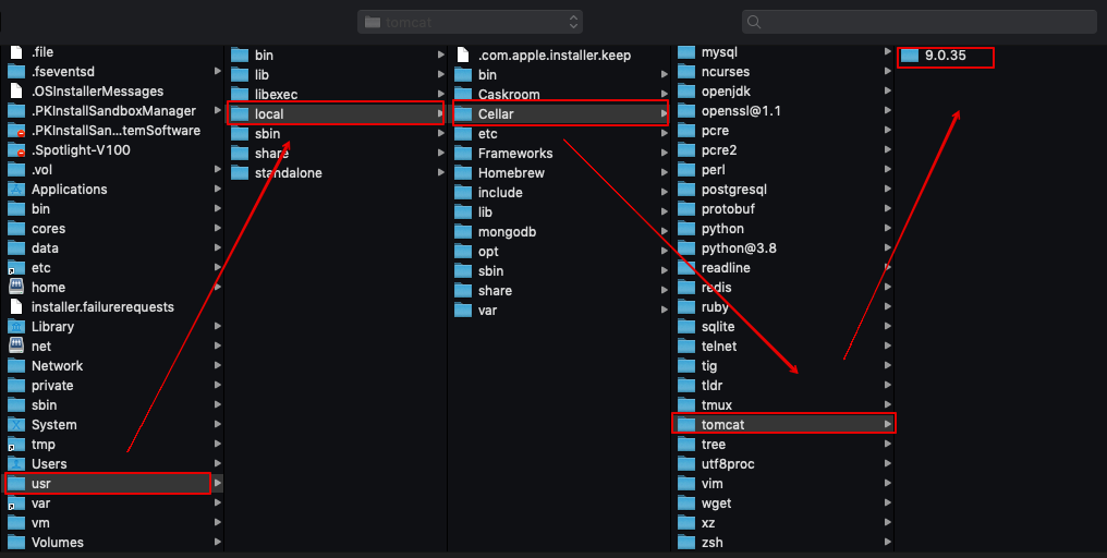 > usr/local/Cellar/tomcat/<버전 명>/libexec