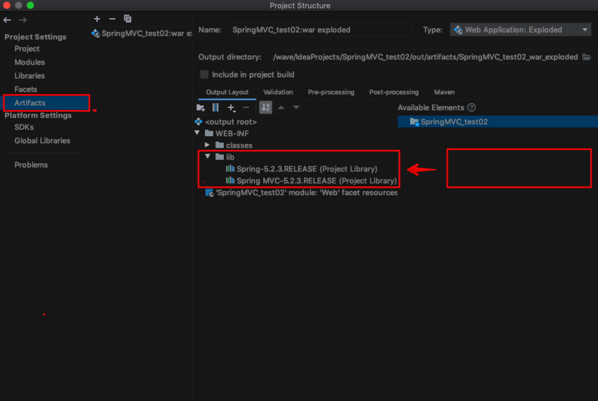 그 다음 아래와 같이Project Struture에 있는 Artifacts에서 Available Elements에 있는 라이브러리를 추가한다.