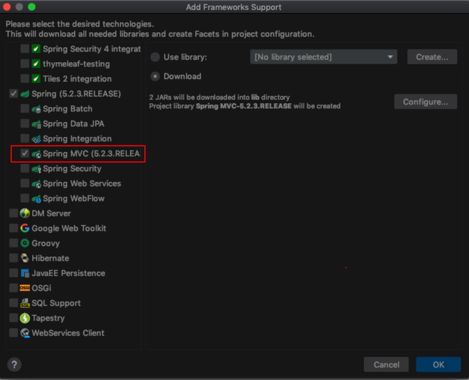 - 프로젝트 생성 후 Add Framework Support 에서 Spring MVC 추가