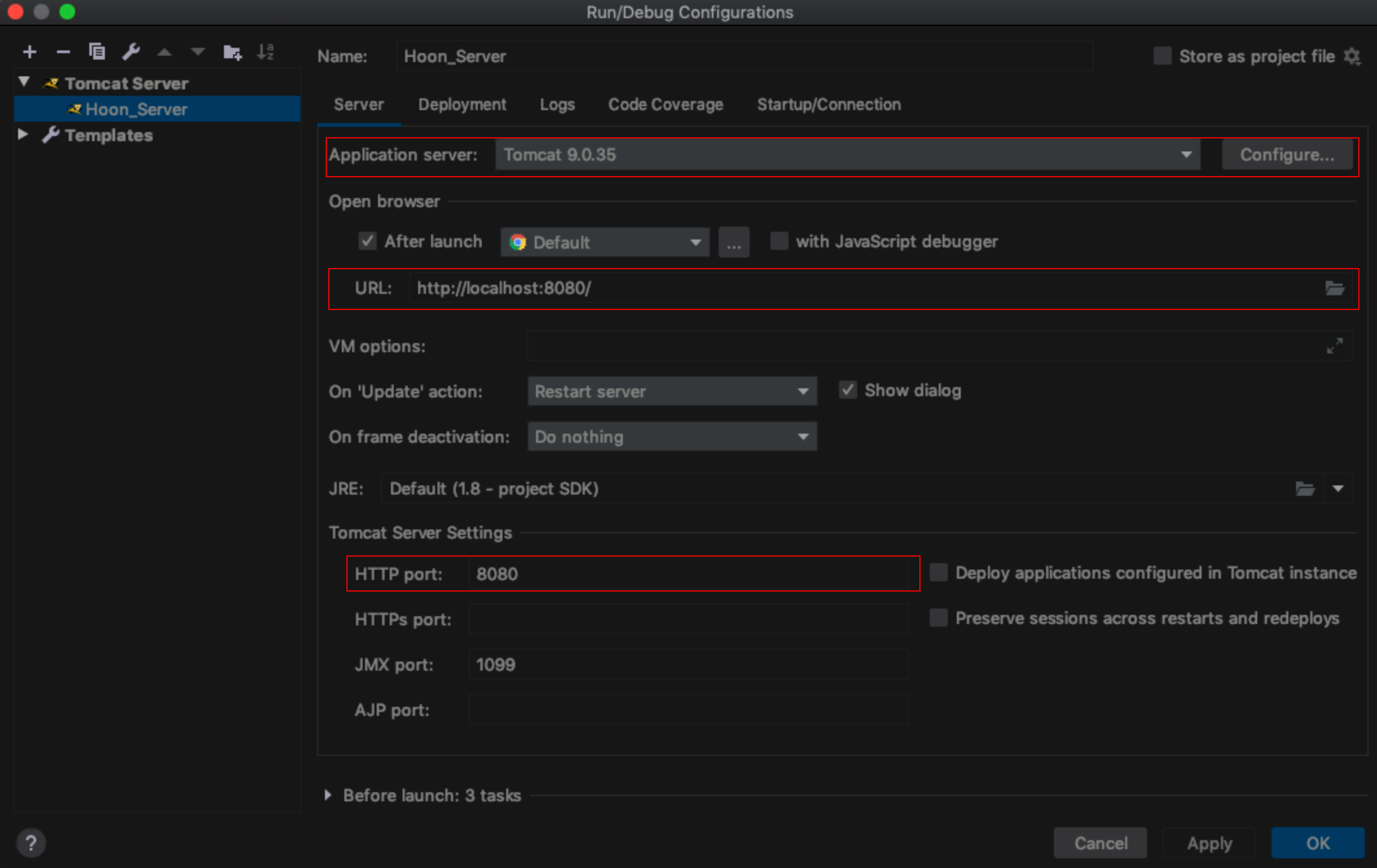 아래 그림과 같이 적용할 톰켓 서버와 URL주소 포트 등을 설정하자.