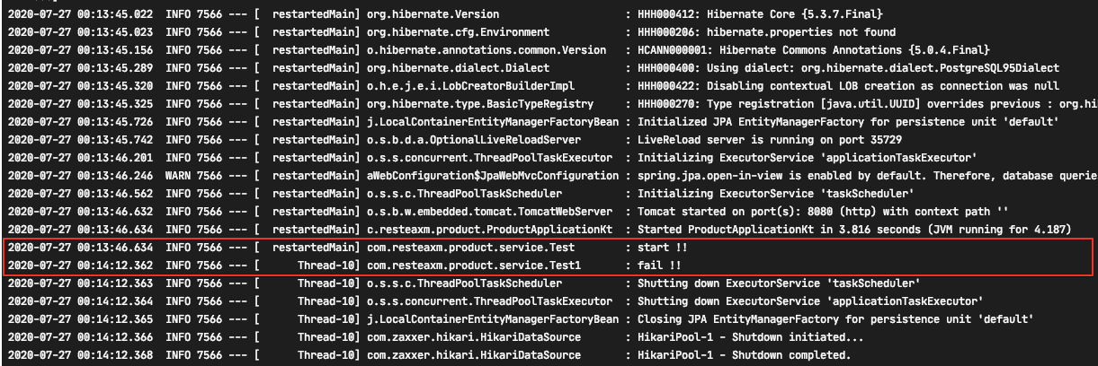 Application 시작 시에는 ApplicationStartedEvent 클래스를 상속 받아 인자로 넘겼고, 종료 시에는 마찬가지로 ContextClosedEvent 클래스를 상속 받아 인자로 넘겼다.
