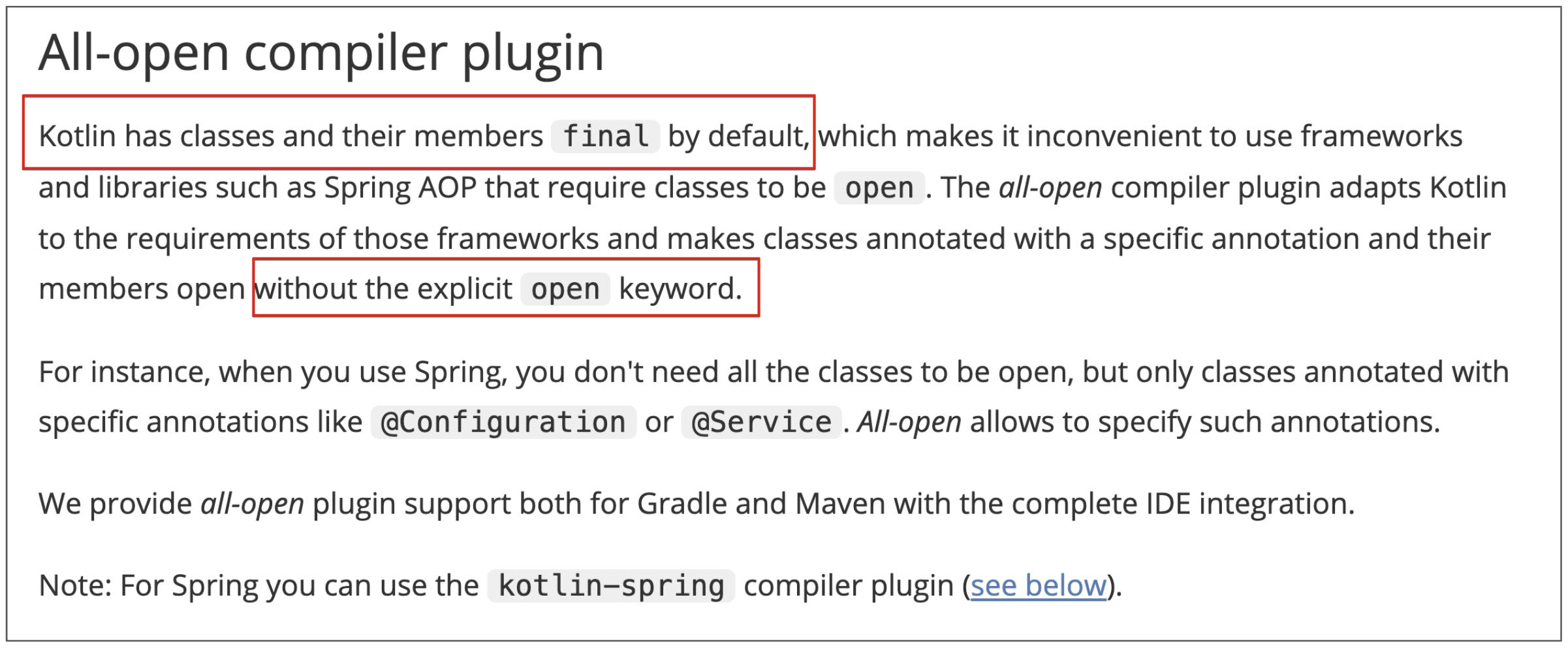 코틀린 공식 문서에 따르면 All-open 플러그인을 사용하면 명시적으로 open 키워드를 붙이지 않아도 된다고 소개하고 있다.