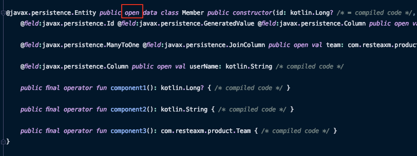 위와 같이 의존성을 추가하고 프로젝트를 빌드를 하면 아래와 같이 데이터 클래스에 open 키워드가 붙어있는 것을 확인할 수 있다.
