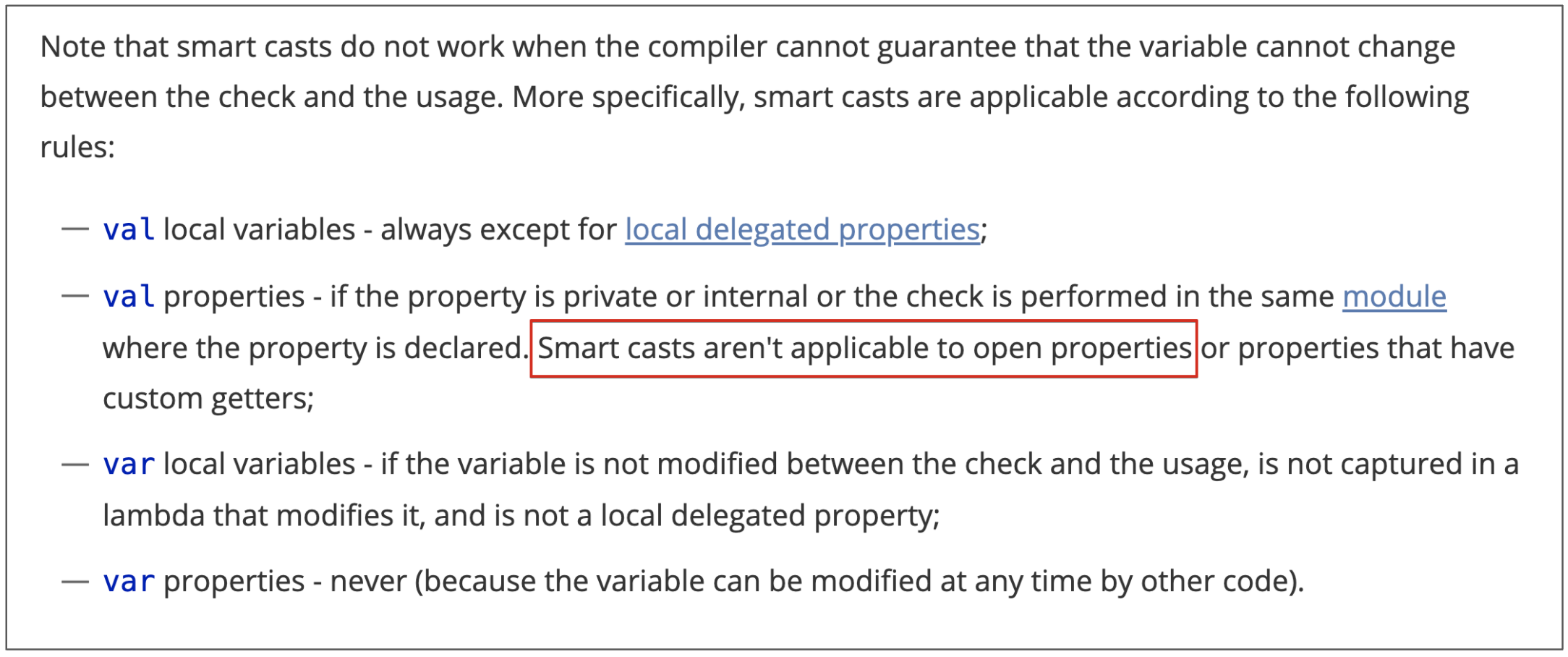 open 속성을 갖고 있는 val 프로퍼티에 대해서는 스마트 캐스트를 제공해주지 않는 문제이다.