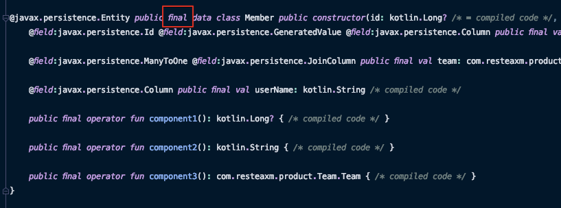 위 Member 클래스를 확인해보면 여전히 final 속성인 것을 알 수 있다.