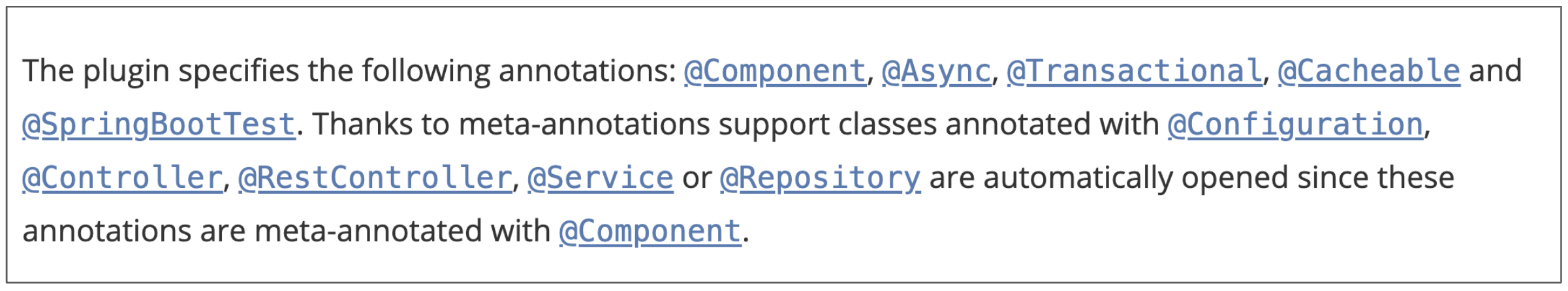 문서 하단으로 내려가 보면 All-open 플러그인 의존성 추가 시, 자동으로 적용되는 어노테이션 종류가 많지만 @Entity는 자동으로 적용되지 않는 것을 확인하였다.
