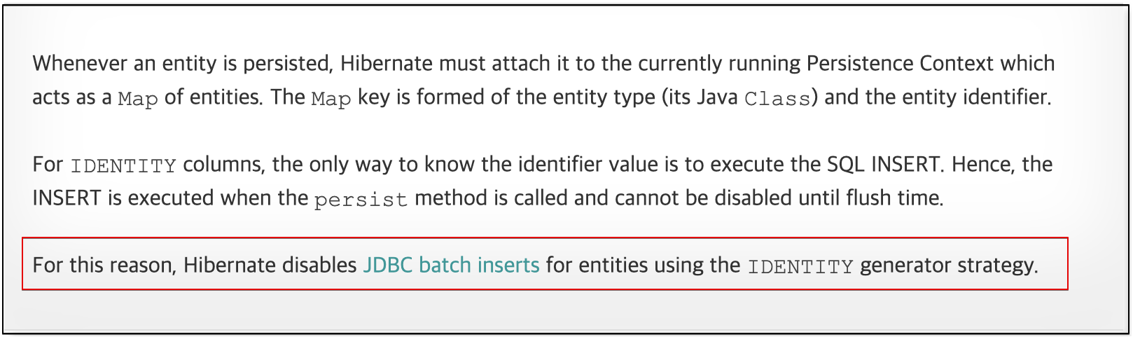 Vladmihalcea 블로그 글에서 내용을 확인 해보면 GenerationType.IDENTITY을 사용할 경우 Hiberbate에서 Batch Insert를 비활성화 처리를 한다는 내용을 확인할 수 있습니다.