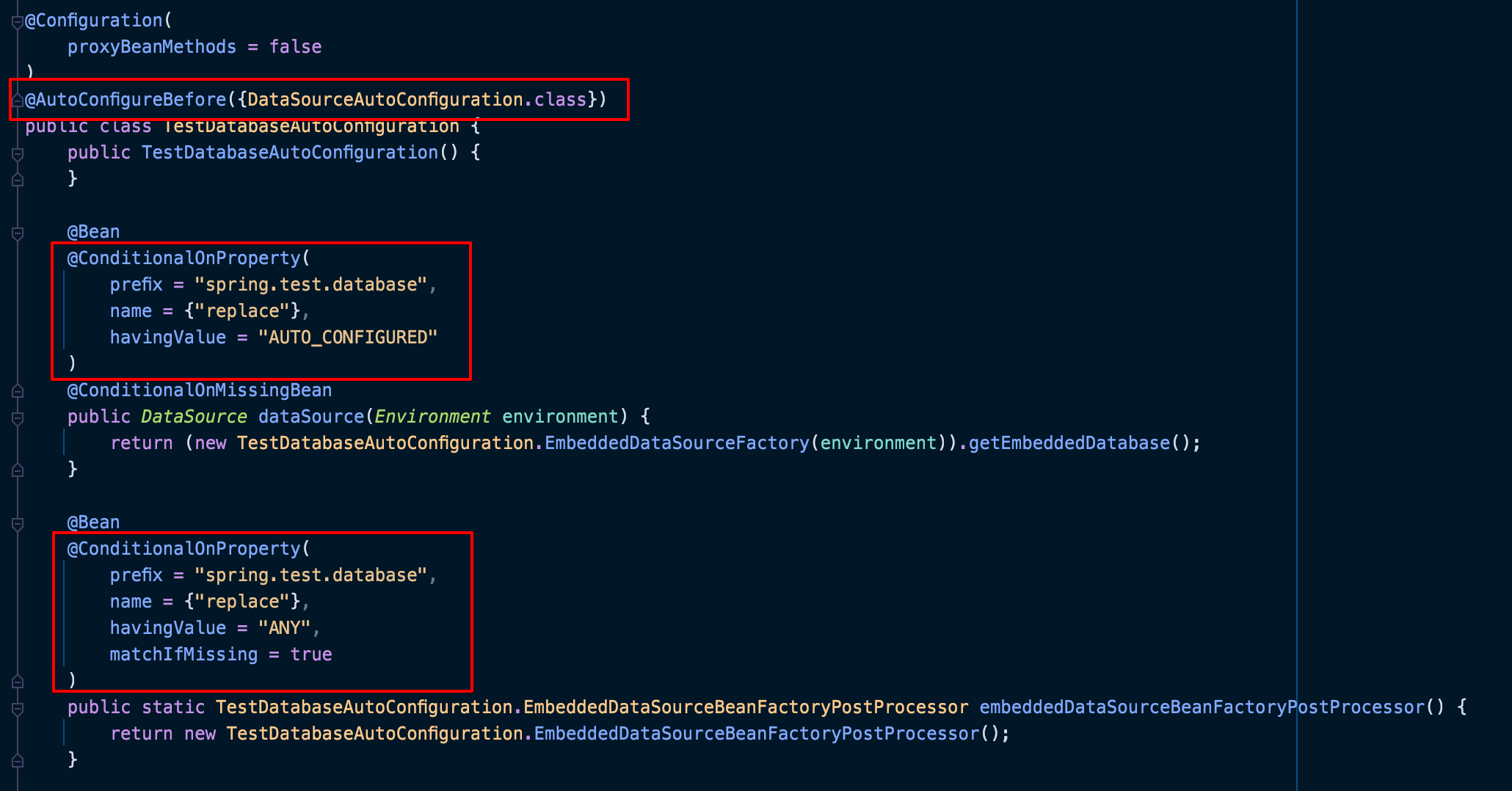 아래 TestDatabaseAutoConfiguration 코드를 살펴보면 Replace 가 AUTO_CONFIGURED 또는 ANY 일 경우 embedded DB 를 생성하고 NONE 일 경우 아무런 행위 없이 지나가고 DataSourceAutoConfiguration 이 실행되는 것을 볼 수 있다.