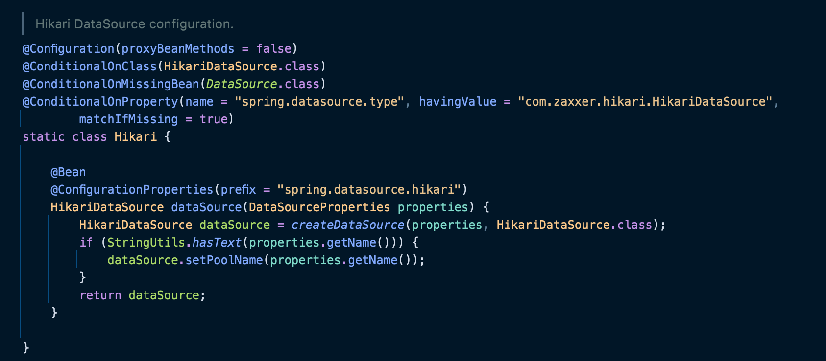 아래는 DataSourceConfiguration 클래스에 있는 내부 클래스 Hikari 코드이다.
