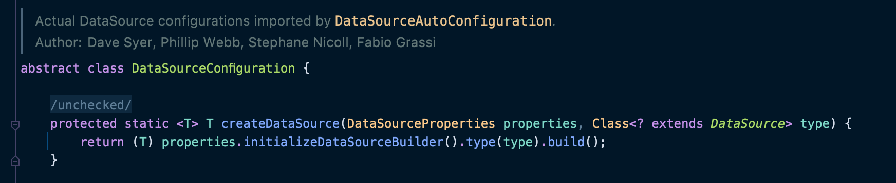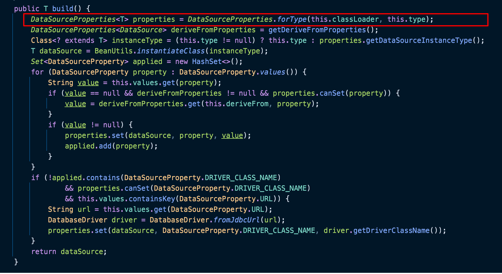 문제의 원인은 위에서 발견했지만, DataSource 가 어떻게 생성이 되는지 궁금하여 DataSourceBuilder 코드를 좀 더 살펴 보았다.