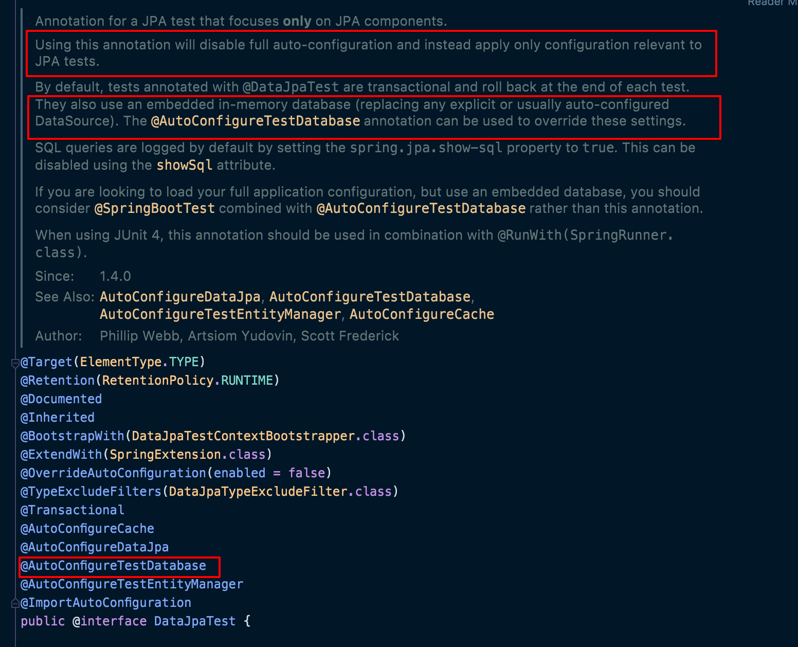 스프링 코드는 여기까지 살펴보고 정리하자면, @DataJpaTest 를 사용할 때 Spring boot 에서 기본적으로 지원하는 자동 설정으로 실행이 되기 때문에 오류가 발생한다. 이 문제를 해결하기 위해 @ImportAutoConfiguration 를 사용하여 등록한 Datasource 설정 클래스를 Import 시켜줘야 한다.