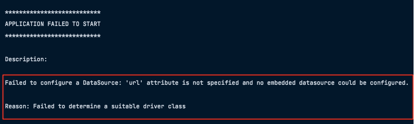 Failed to configure a DataSource: 'url' attribute is not specified and no embedded datasource could be configured. Reason: Failed to determine a suitable driver class