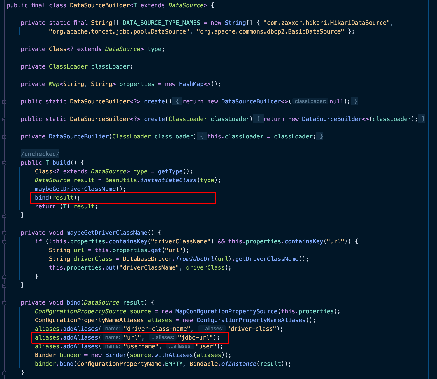 build( ) 메서드를 살펴보면, DataSource Type 을 가져오고 나서 bind( ) 메서드를 호출하여 url 과 jdbc-url 을 서로 매핑하는 것을 볼 수 있다.