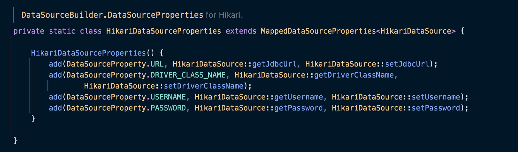 코드를 보면 DataSourceProperty 에 있는 값, 그리고 HikariDataSource 의 get(set) 메서드를 파라미터로 넘겨줘서 add( ) 하고 있는 것을 볼 수 있다.