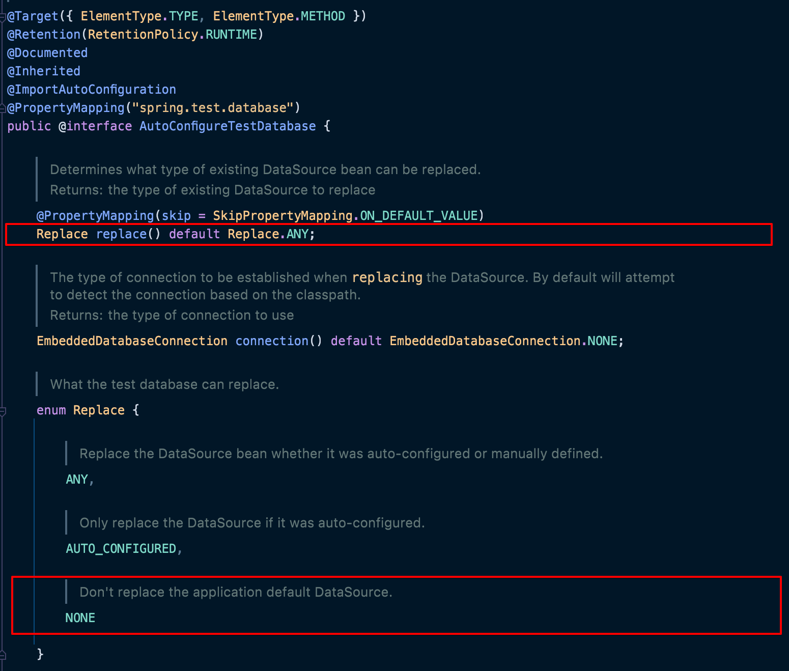 @AutoConfigureTestDatabas 살펴보면, Enum 값인 Replace 가 있는 것을 볼 수 있다.