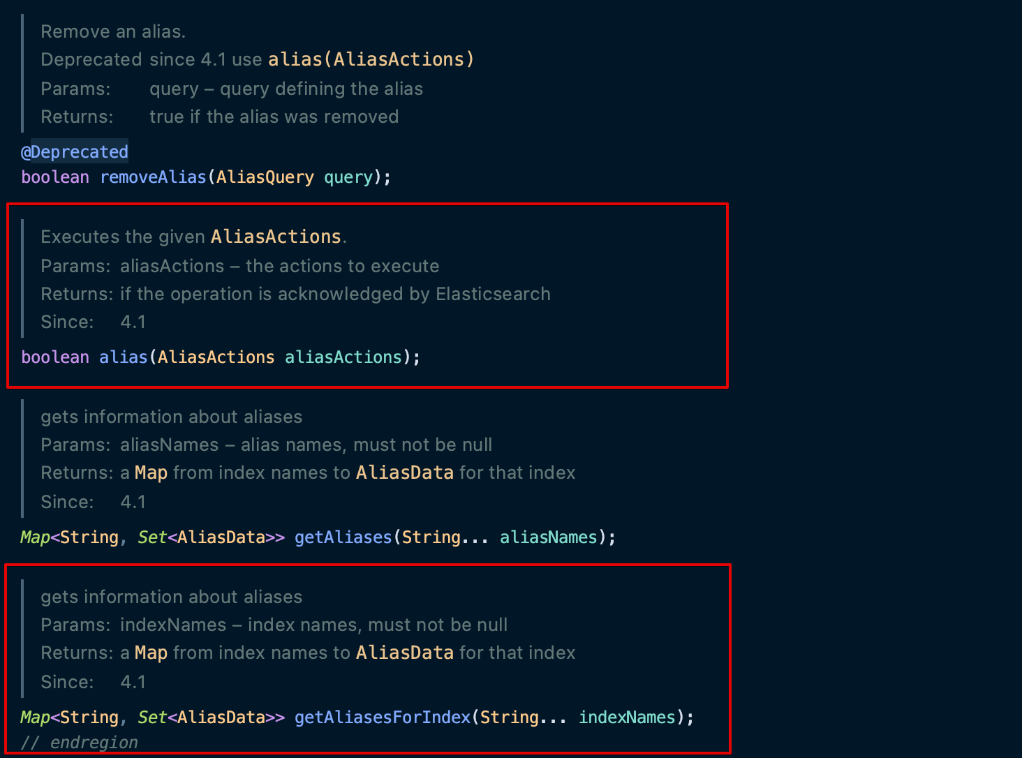 그리고 여러 메서드들이 추가가되었는데, 이번 예제에서 사용할 메서드인 alias( ), 그리고 getAliasesForIndex( ) 가 추가되었다.