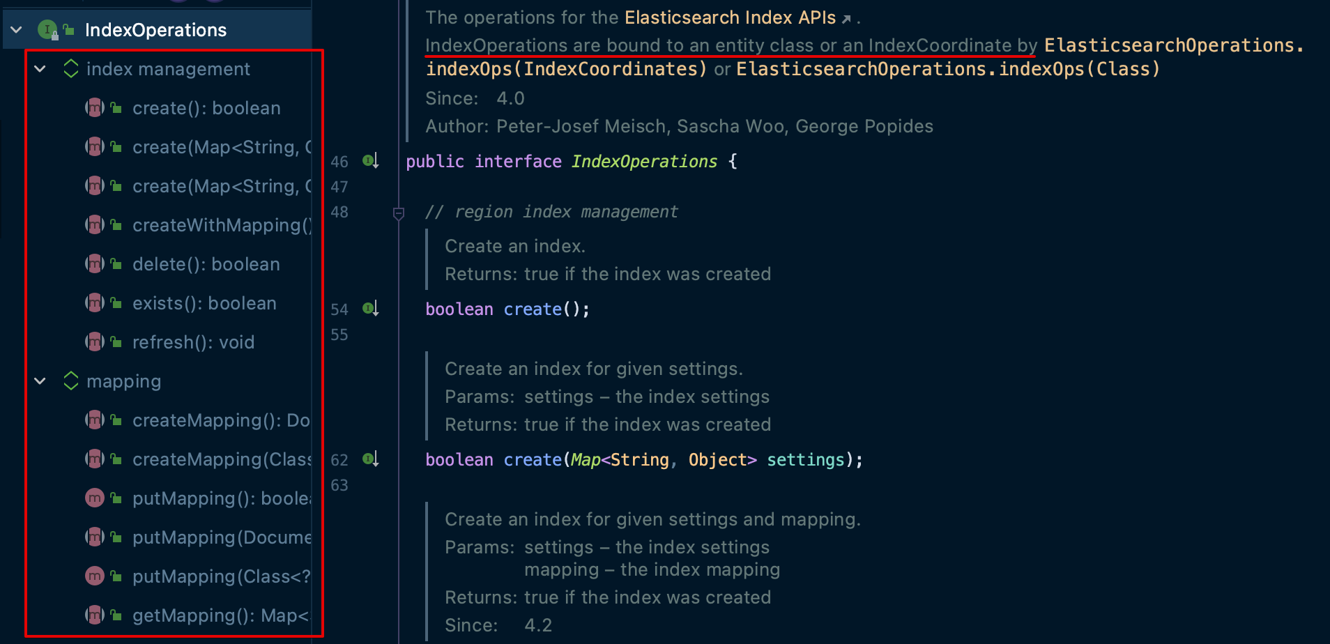 그리고 ElasticsearchOperations 인터페이스에서 사용하는 IndexOperations 인터페이스를 사용하면 인덱스 생성, 삭제, Alias 설정 등 다양한 기능을 지원해준다. 아래 이미지는 해당 인터페이스의 일부분만 갭쳐하였고, 실제로 확인해보면 더 많은 메소드들을 볼 수 있다.