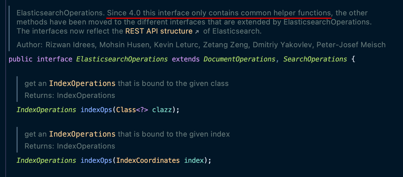 눈에 띄는 것은 ElasticsearchOperations 인터페이스이다. 해당 인터페이스를 호출하여 Elasticsearch 에 요청을 간편하게 보낼 수 있다.