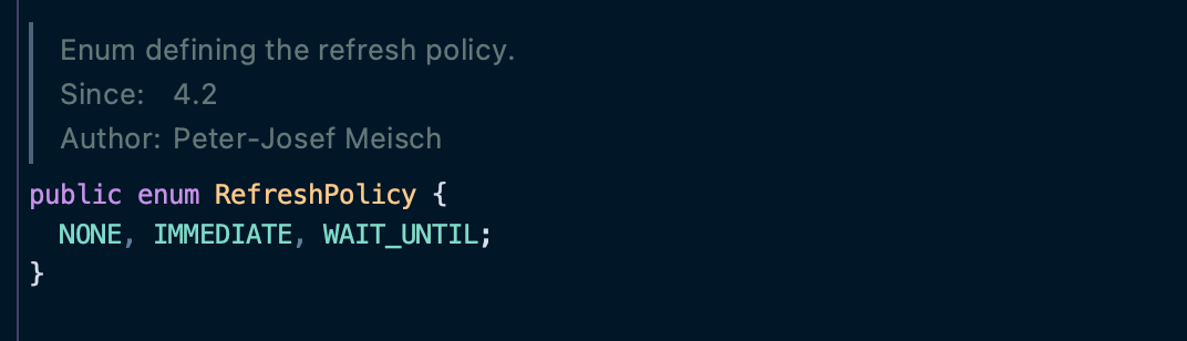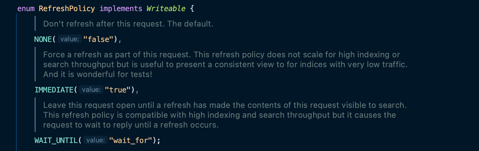 코드와 주석을 보면 Spring data elasticsearch 에서 정의한 RefreshPolicy Enum 과 이름이 동일한 것을 알 수 있고, 각각 옵션에 대한 설명이 적혀있다.