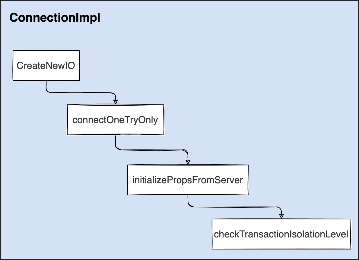마지막으로 checkTransactionIsolationLevel 메소드에서 MySQL 서버와 커넥션을 맺고 isolataion level 을 가져오게 된다.