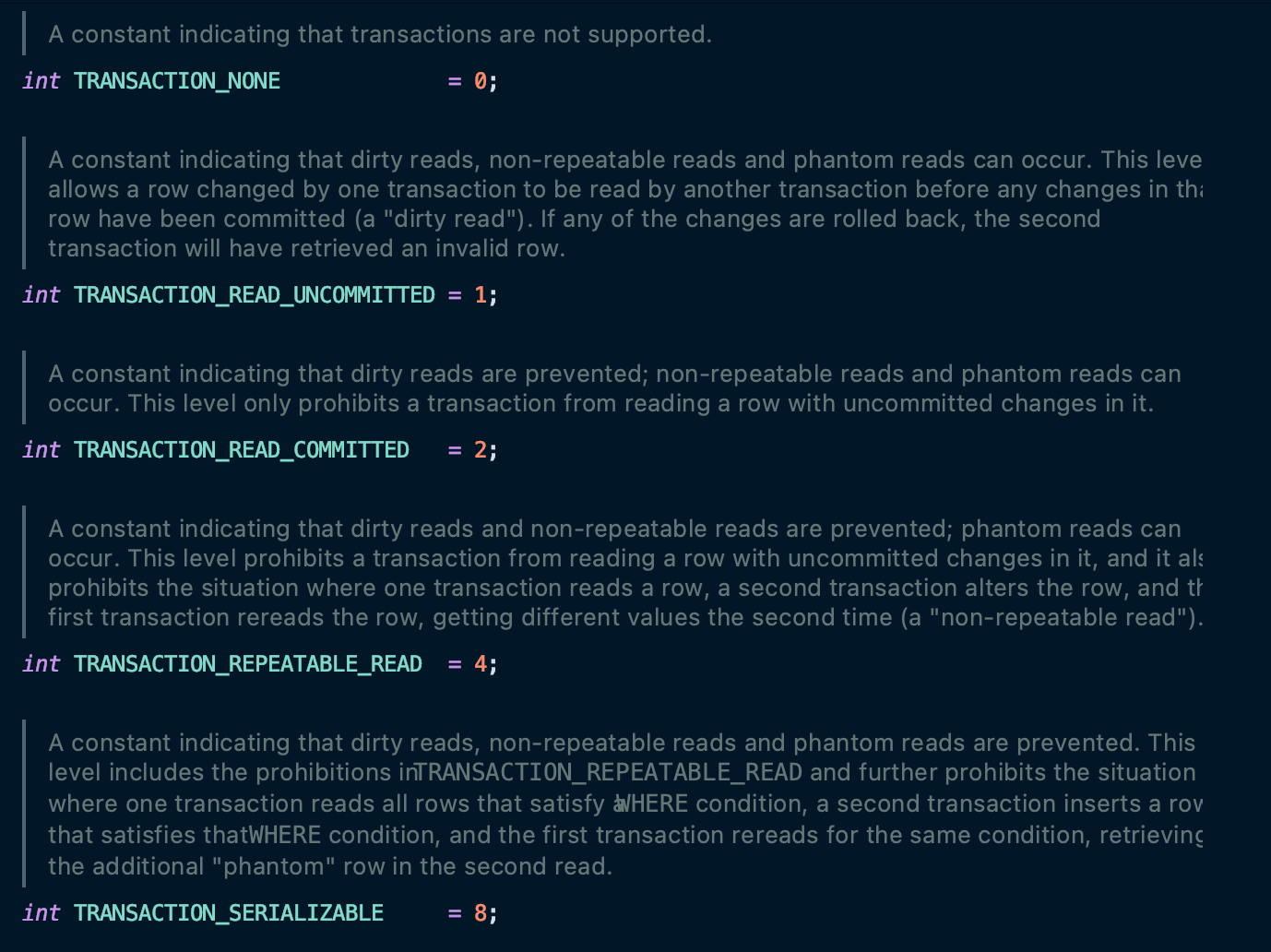 해당 값이 의미하는 바는 Connection interface 에서 확인할 수 있다.
