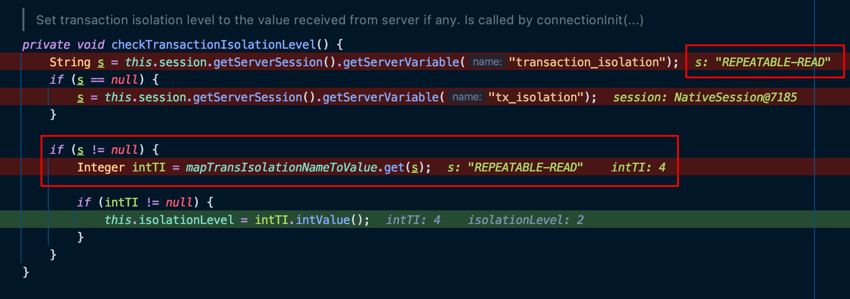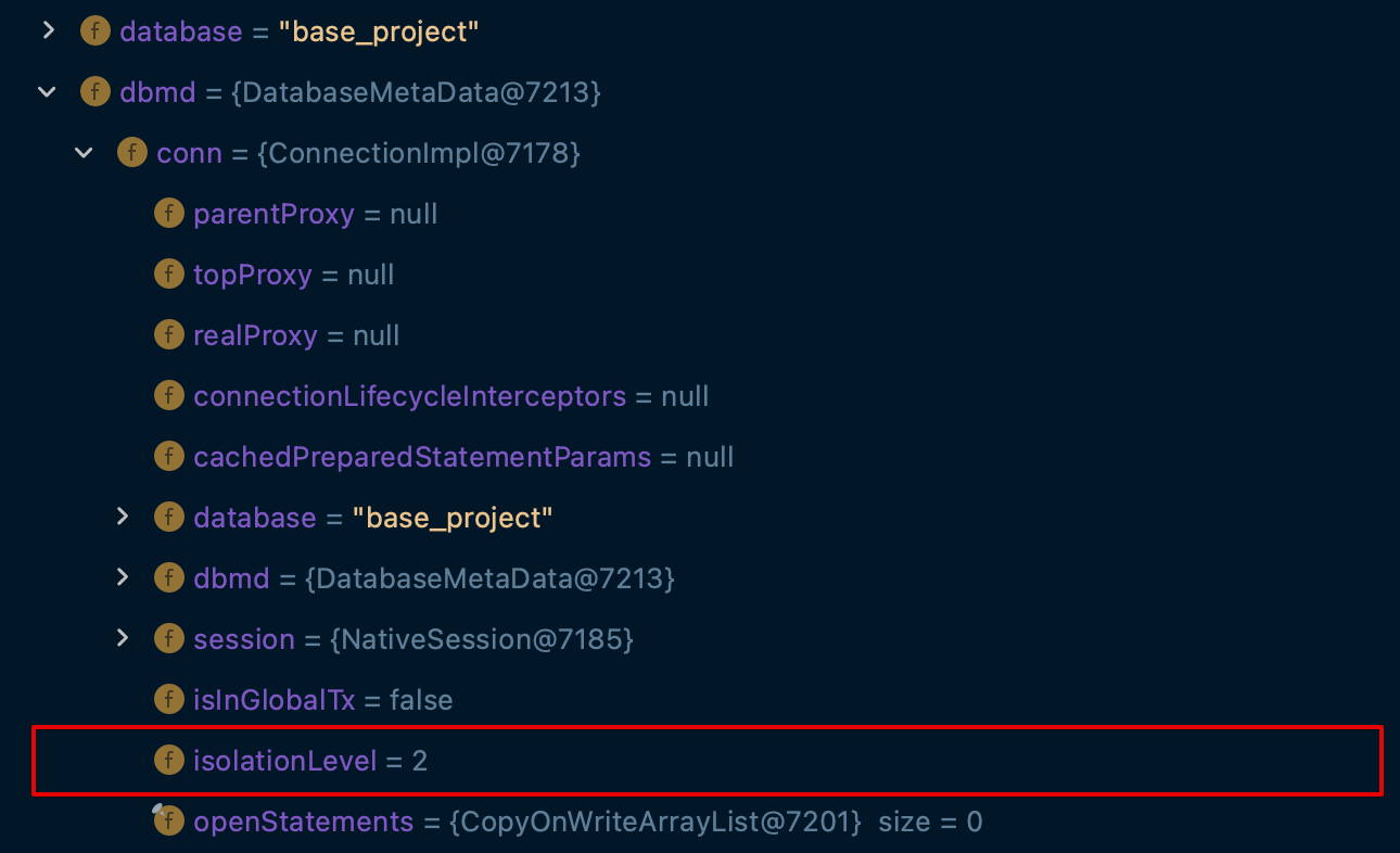 해당 라인을 실행시켰을 때 디버깅한 값을 확인해보면 isolation level = 2(READ_COMMITTED) 로 세팅된 것을 볼 수 있다.