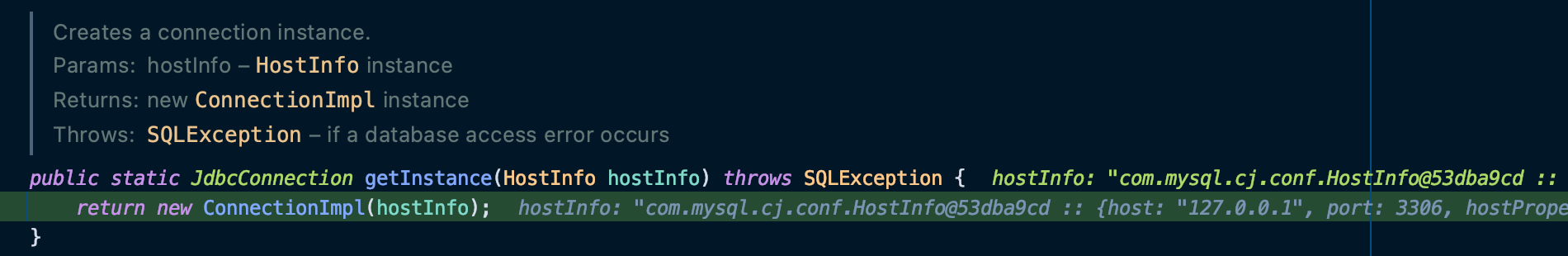 ConnectionImpl 클래스의 getInstance 메소드는 정말 단순하다.