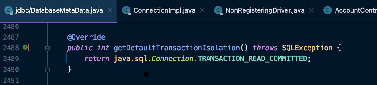 생성이 되는 Connection 객체는 com.mysql.cj.jdbc.ConnectionImpl 클래스이며 해당 객체가 생성이 되면서 isolation level 도 결정한다.