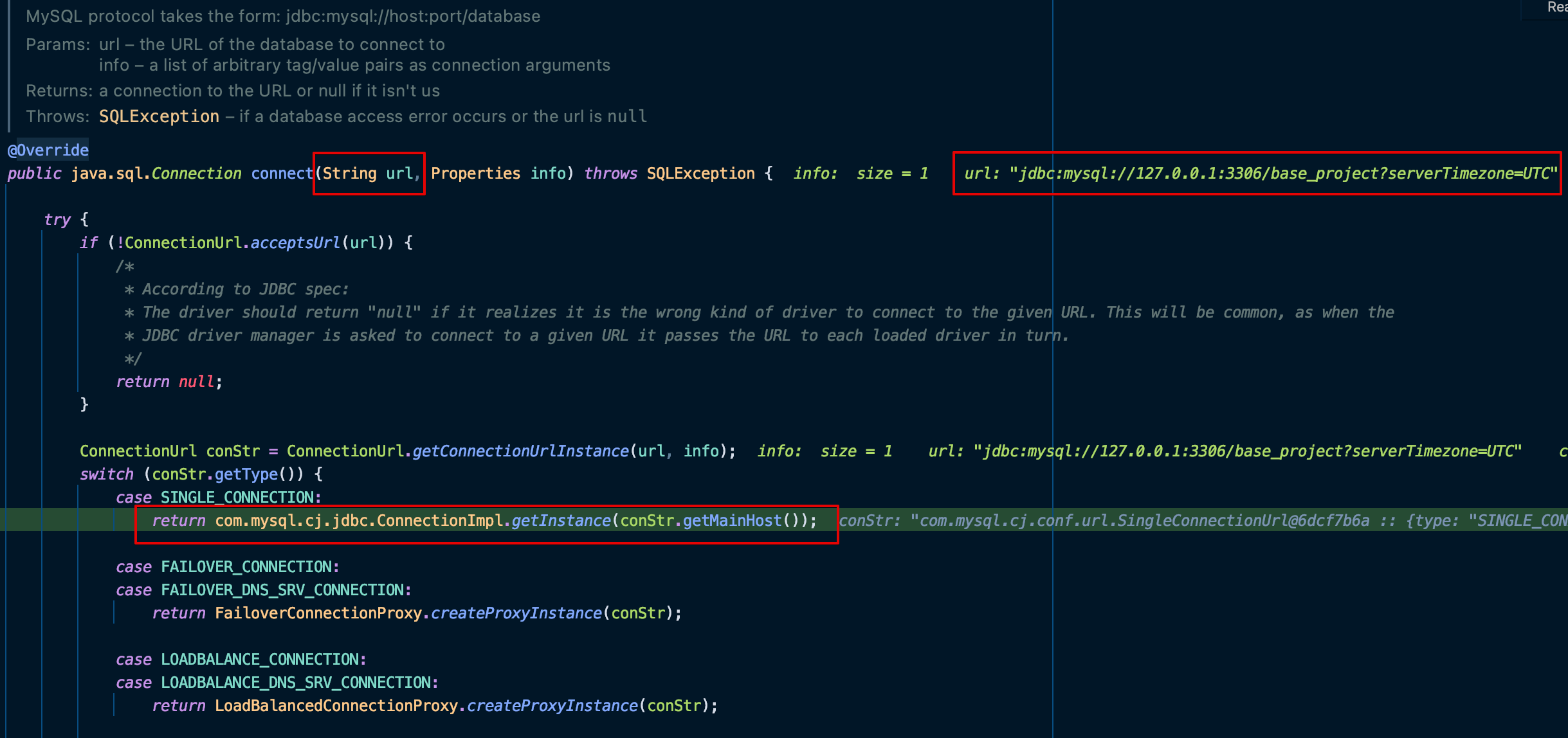 Spring 애플리케이션을 실행시키면 NonRegisteringDriver 클래스의 connect 메소드는 jdbc url 을 파라미터로 전달 받은 후에 Connection 객체를 생성 후에 리턴을 하게 된다.