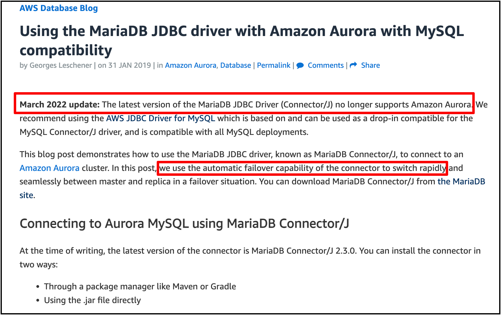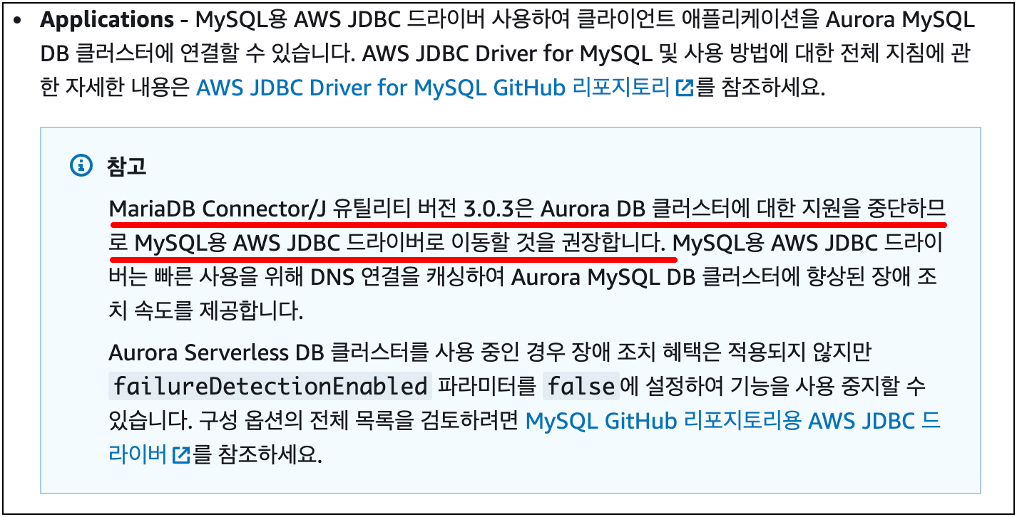 처음에는 기존에 사용하였던 MariaDB connector / J 를 사용하려고 하였지만, 위와 같은 문제로 대안을 찾기 위해 AWS 공식 문서를 확인해보기로 했다.