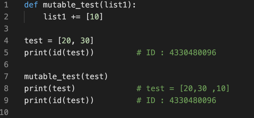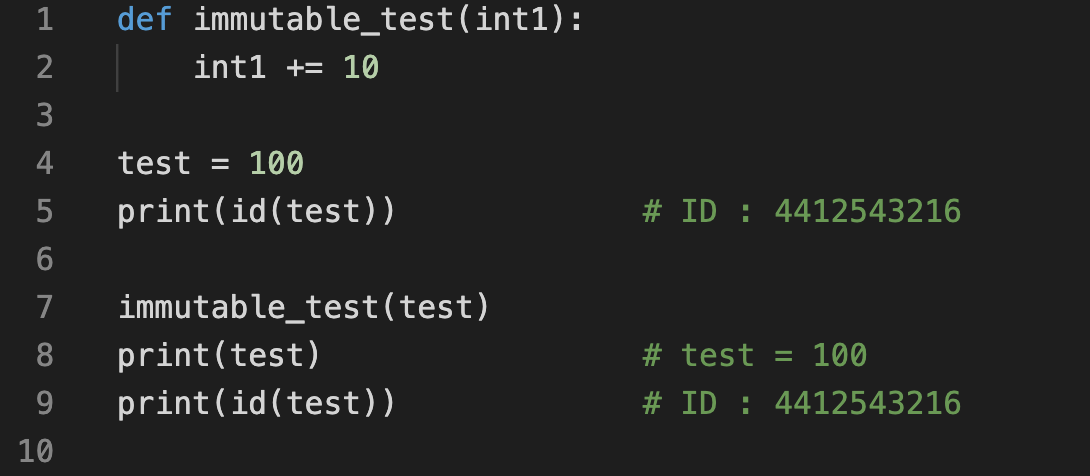 위 예제를 살펴보면 test라는 변수의 ID값과 함수 호출 후 test의 ID 값은 동일한 것을 알 수 있지만, 함수 호출 전후의 값이 동일한 것을 알 수 있다. 즉, 정수 타입의 객체(불변 객체)는 call by value로 동작되었음을 알 수 있다.
