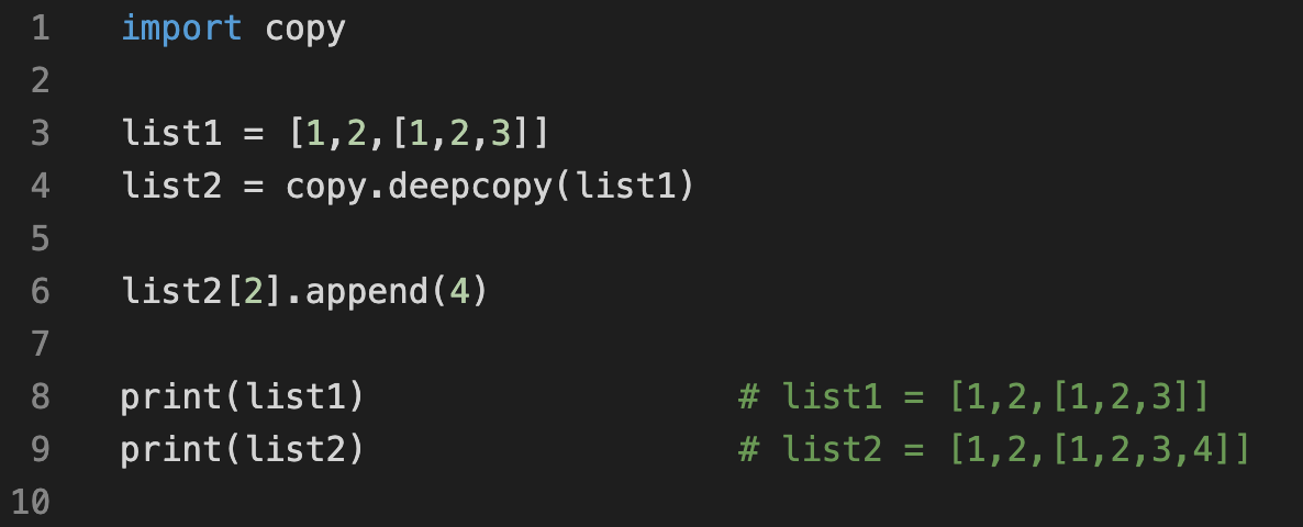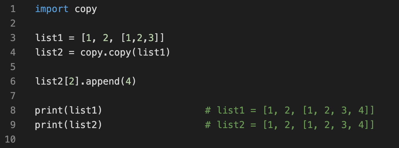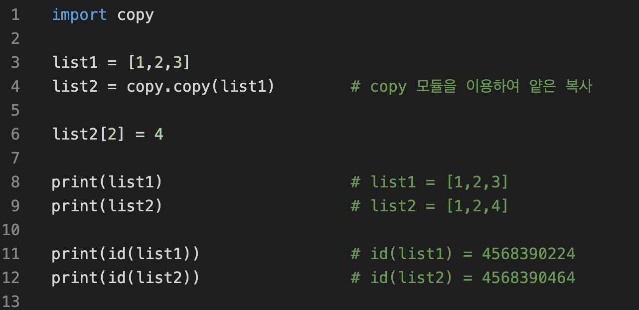 얕은 복사는 아래 코드와 같이 리스트를 슬라이싱(ex. list1 = list2[:]) 하거나 copy라는 모듈을 사용하여 할 수 있다.