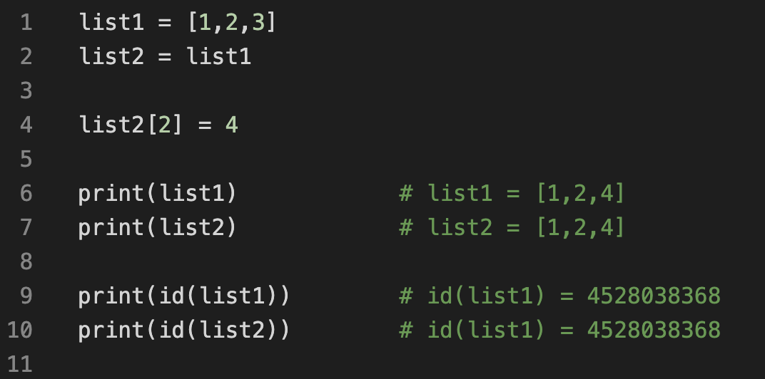 즉, list2 = list1 과 같이 단순 복사는 객체 복사가 이루어지는 것이 아닌 단순히 같은 메모리 공간을 참조한다는 것을 알 수 있다.