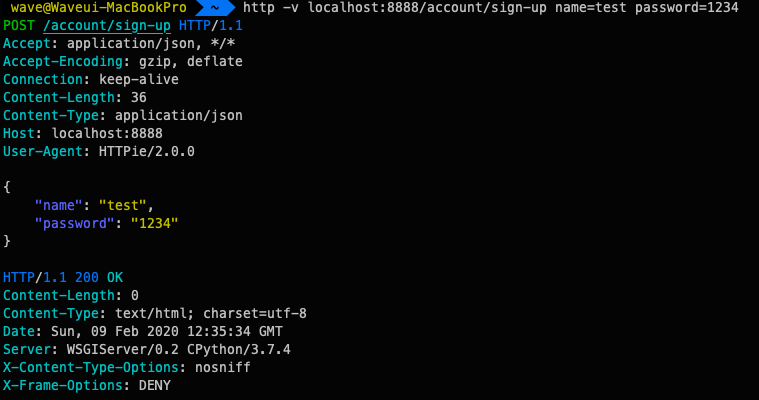 name = test, password = 1234 로 /accoun/sign-up 경로로 Request 요청 시 정상적으로 200 OK가 출력되는 것을 볼 수 있다.