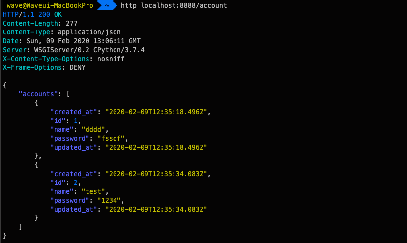 post 메서드로 요청 받을 시 name 과 password를 저장하는 기능을 구현하였고 get 메서드로 요청 받을 시 account 테이블에 저장된 리스트를 출력하도록 하였다.