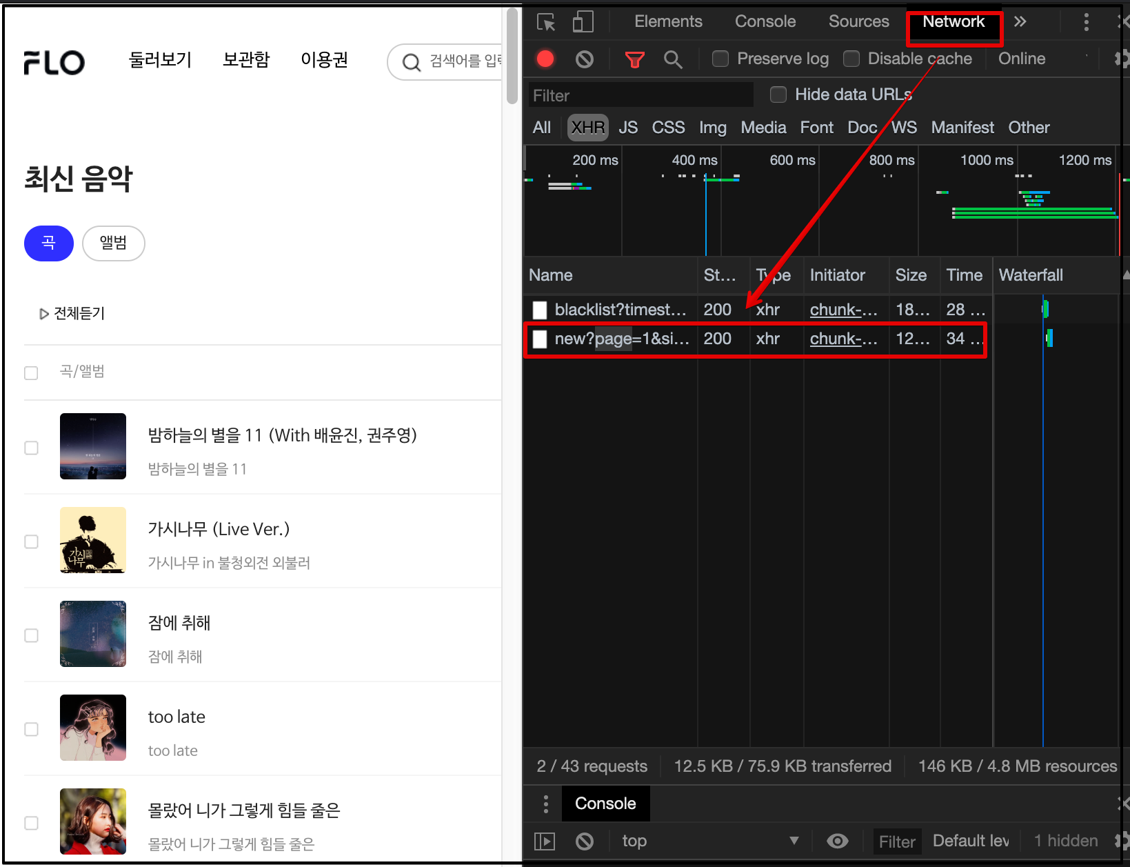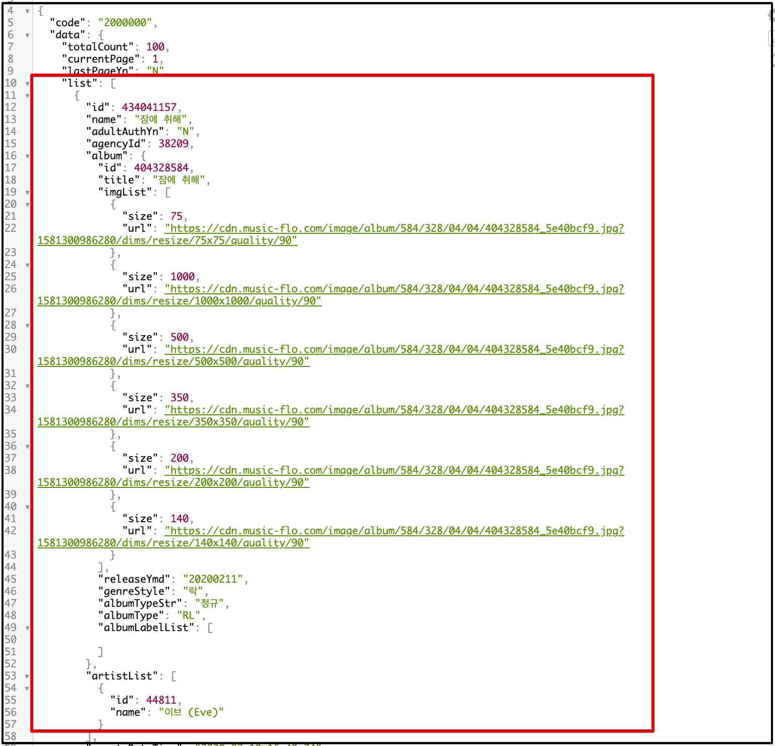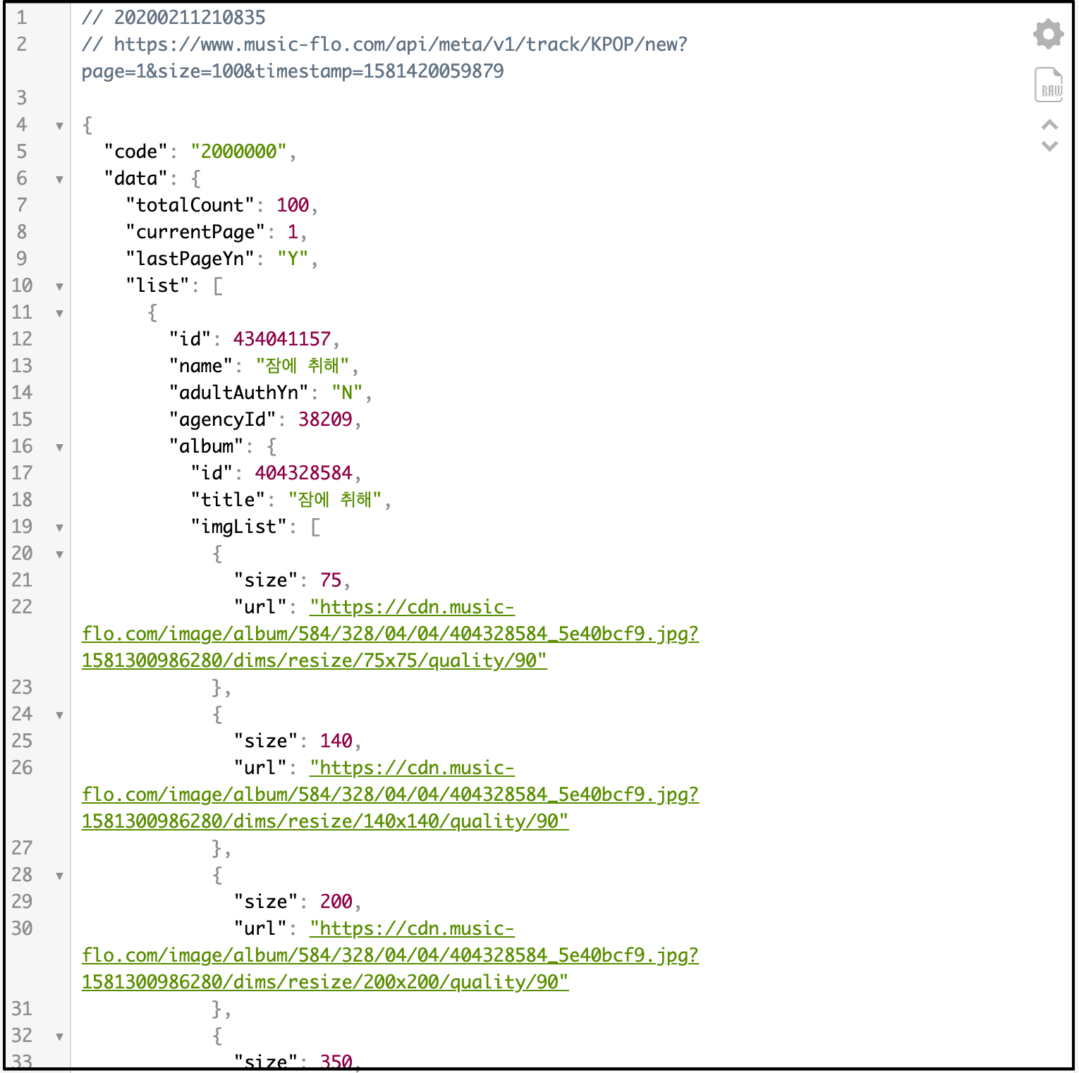 - API URL : https://www.music-flo.com/api/meta/v1/track/KPOP/new?page=1&size=100×tamp=1581420059879