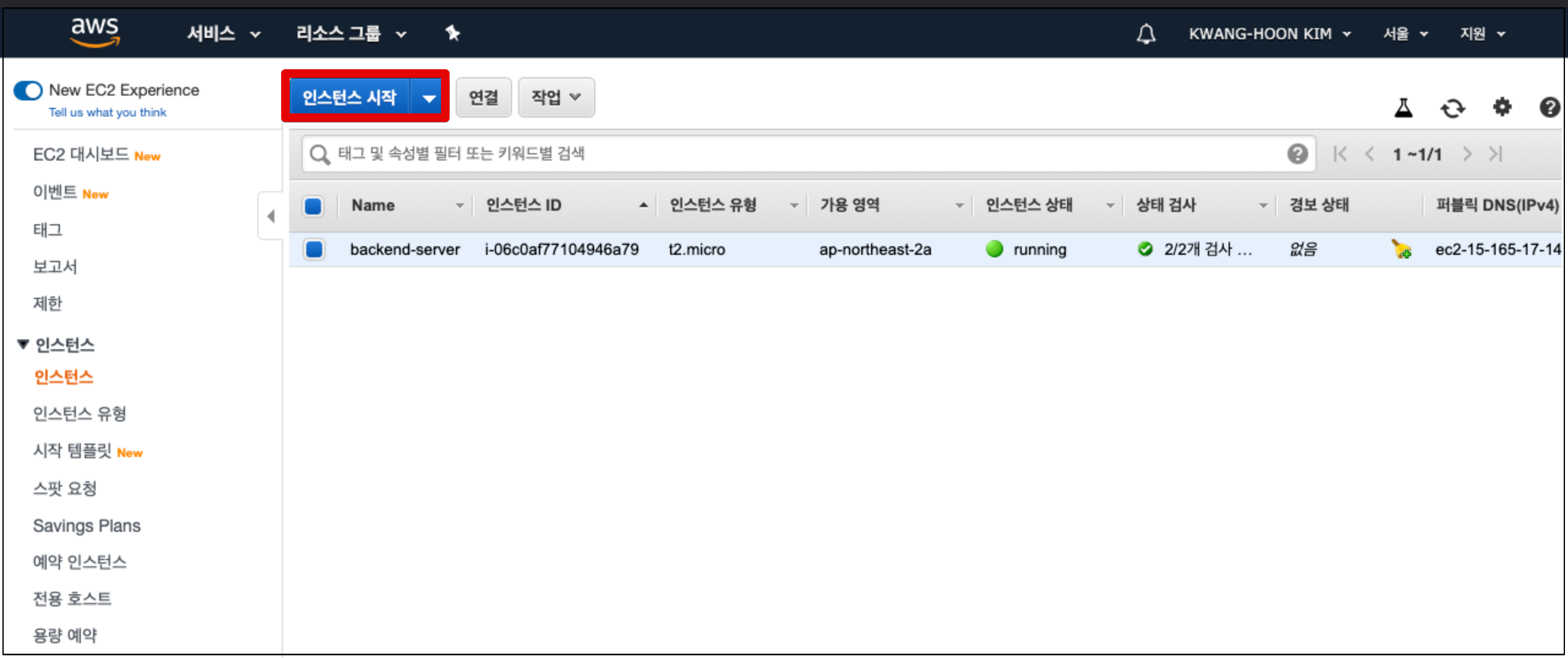 AWS에 로그인 후, 콘솔에 접속하여 EC2 서비스 항목으로 이동하여 인스턴스 시작을 클릭한다.