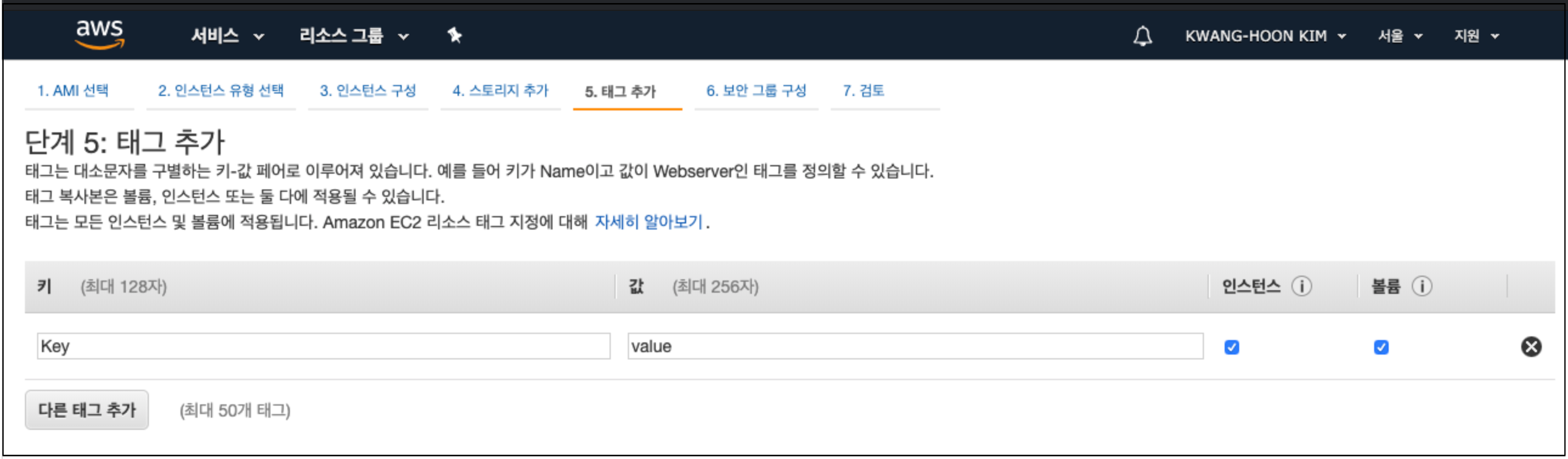 태그를 설정할 수 있으며, 태그는 인스턴스를 식별하는데 사용되며, 리소스를보다 쉽게 관리 가능함