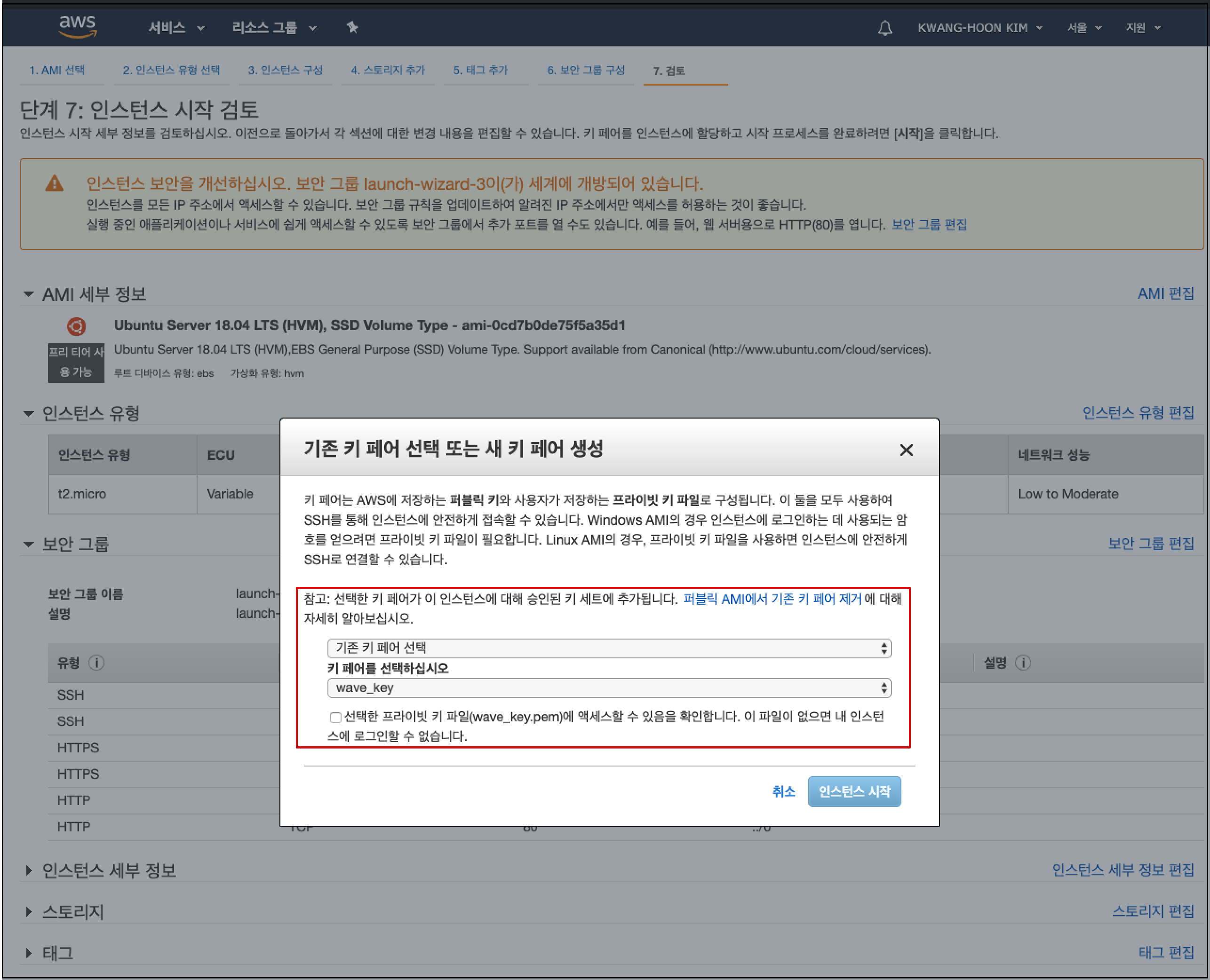 7. 인스턴스 시작 검토 및 Private Key(개인키) 설정