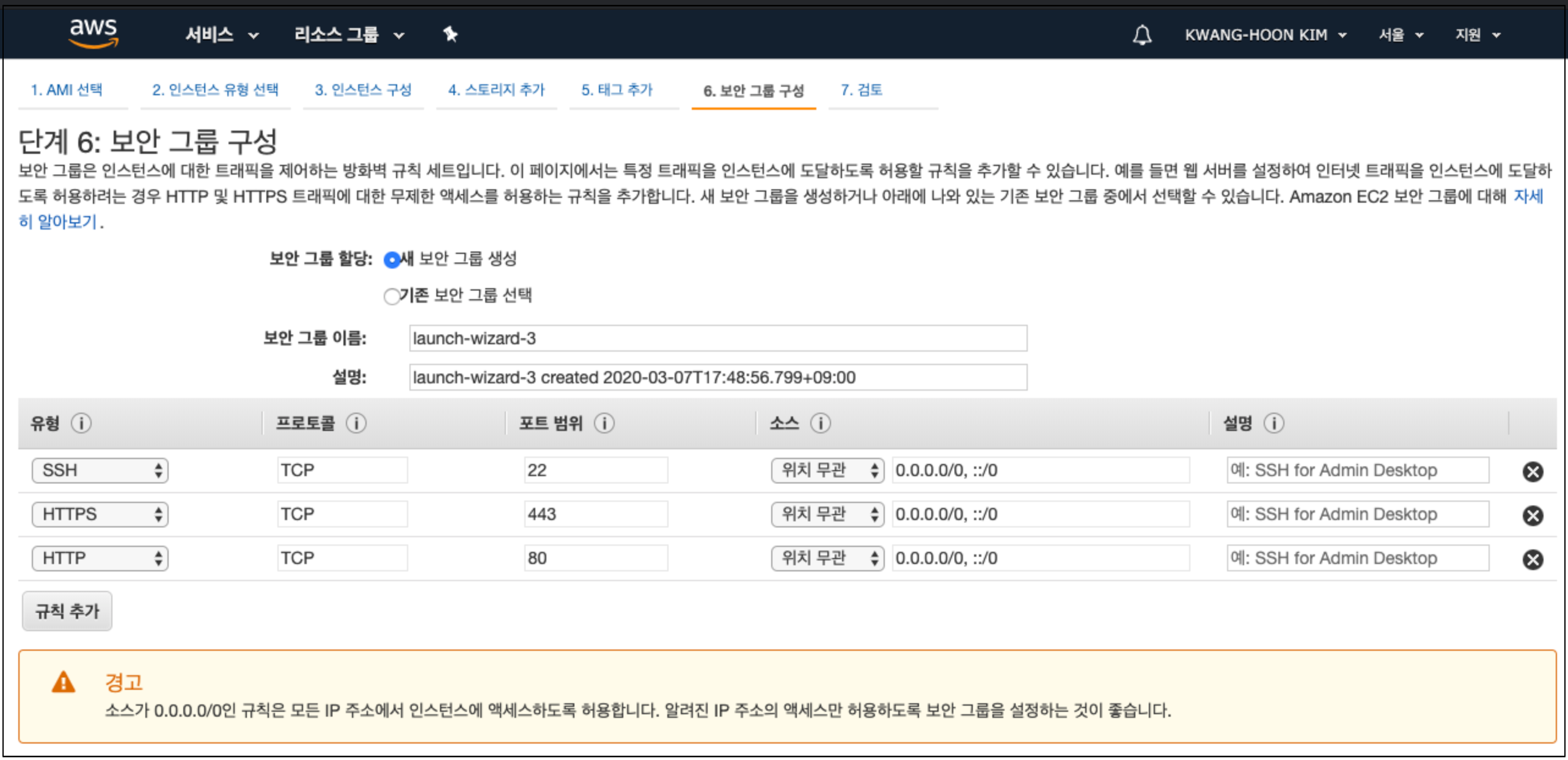 AWS에서는 방화벽을 Security Group이라고한다. 이 페이지에서 방화벽 룰 설정이 가능한다.